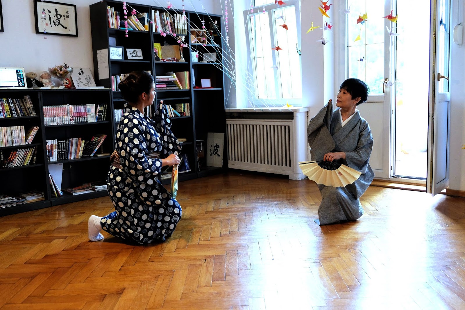 Od kilku lat trochę się uczę, ale od wielu lat podziwiam tradycyjne tańce japońskie. Za ich piękno i elegancję, subtelność i sposób opowiadania historii. Jeszcze do niedawna byłam przekonana, ze to sztuka dostępna tylko nielicznym i na pewno nie tym spoza Japonii. Okazało się jednak, ze powiedzenie "nigdy nie mów nigdy" kolejny raz zostało obalone, a ja ponownie miałam to ogromne szczęście, że kilka dni temu już po raz trzeci mogłam uczestniczyć w warsztatach jiutamai razem z mistrzynią Tokijyo Hanasaki (o poprzednich pisałam tutaj i tutaj). Mistrzyni ponownie odwiedziła Warszawę, Kraków oraz Wrocław na zaproszenie Fundacji NAMI. W podróży zawsze towarzyszy jej sensei Hana Umeda na co dzień praktykująca klasyczny taniec japoński nihon buyō, z którą mamy warsztaty kilka razy do roku.
